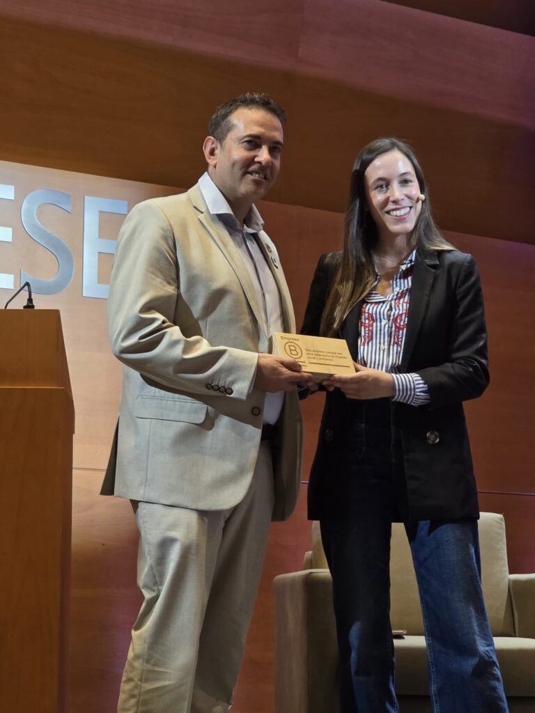 Al finalizar su intervención, le ha dado entrega a Marcos González, Presidente Editor y Fundador de Corresponsables, su Fundación y ObservaRSE, como medio de comunicación B Corp.